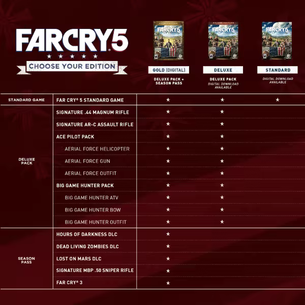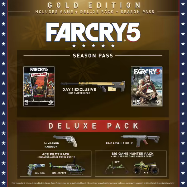 La edición Gold incluye todo el contenido Deluxe y el pase de temporada que incluye Far Cry® 3. Far Cry® 3 estará disponible el 29 de mayo con el pase de temporada de Far Cry 5.