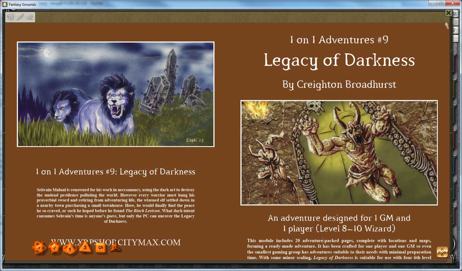 Requires: The free Fantasy Grounds virtual tabletop (VTT) software and the included Pathfinder RPG and D&D 3.5/ OGL ruleset.