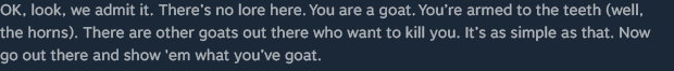 powerful weapons, and fast-paced action. Well, and lots of silly humor, crazy goatstumes (skins), and goat mechanics for you to troll your friends to your heart´s content!