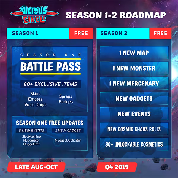 Vicious Circle is an uncooperative multiplayer shooter set in a colorful yet gritty sci-fi universe. Gameplay is fast and frenetic with an emphasis on thwarting other players with dirty tricks at every turn. Be a mercenary and compete for loot, or take on the role of a massive monster and try to kill everything in your path. The first player to collect the biggest haul and reach the evac zone wins - unless the player controlling the big baddy gets them all first.