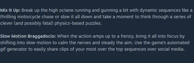 Unleash a torrent of destruction with an incredible level of control over both your weapons and your body. Twist and turn through the air while aiming both hands at priority threats or line up a perfect ricochet to drop an unsuspecting gangster from behind.