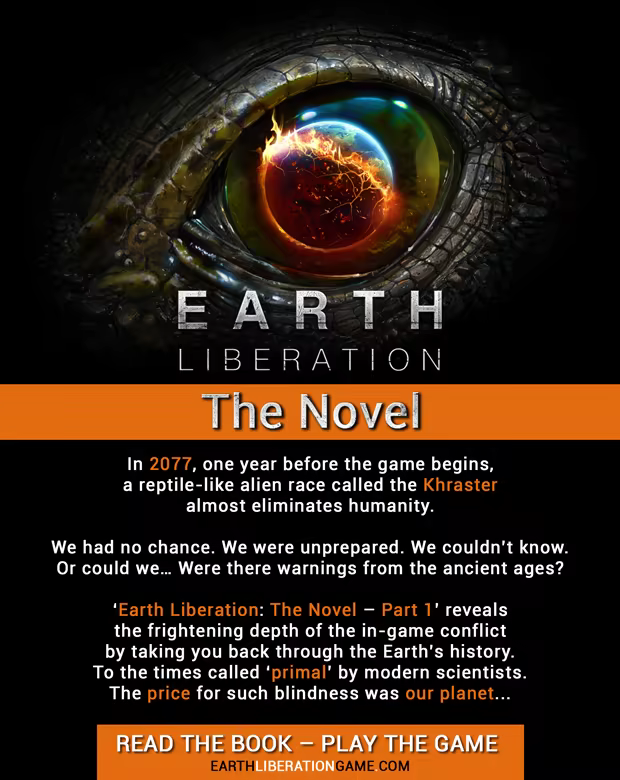One year before the game begins, in 2077, a reptile-like alien race called Khraster almost eliminates нumanity. We had no chance. We were unprepared. We couldn’t know. Or could we… Were there warnings from the ancient ages? “Earth Liberation: The Novel - Part 1” reveals the frightening depth of the in-game conflict by taking you back through Earth’s history. To the times called ‘primal’ by modern scientists. The price for such blindness was Earth.