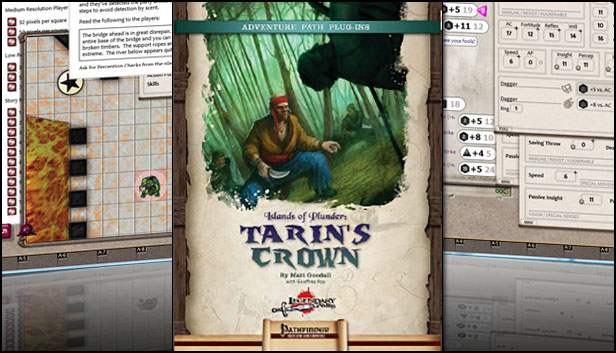 Islands of Plunder: Tarin's Crown is a 28-page adventure for 6th-level PCs fraught with harrowing battles on land and aboard ship, through treacherous terrain against even more treacherous foes. It includes two sets of maps, one for the GM an unkeyed set for players, as well as scaling notes to adjust the difficulty of the adventure for higher or lower-level characters.