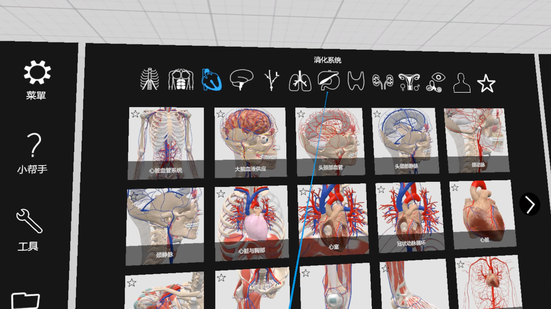 REGIONAL ANATOMY: Dive into a vast collection of preconfigured anatomy models organized in 15 body systems. Each model provides a guided learning environment, equipping you with all the essential information to kickstart your anatomy education.