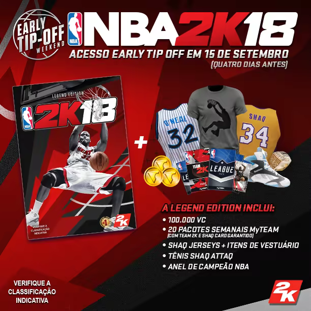 • 40 pacotes MyTEAM para você montar sua equipe de fantasia perfeita (entregues um por semana). Eles incluem um Shaq card garantido, um Team 2K Free Agent card aleatório e mais!