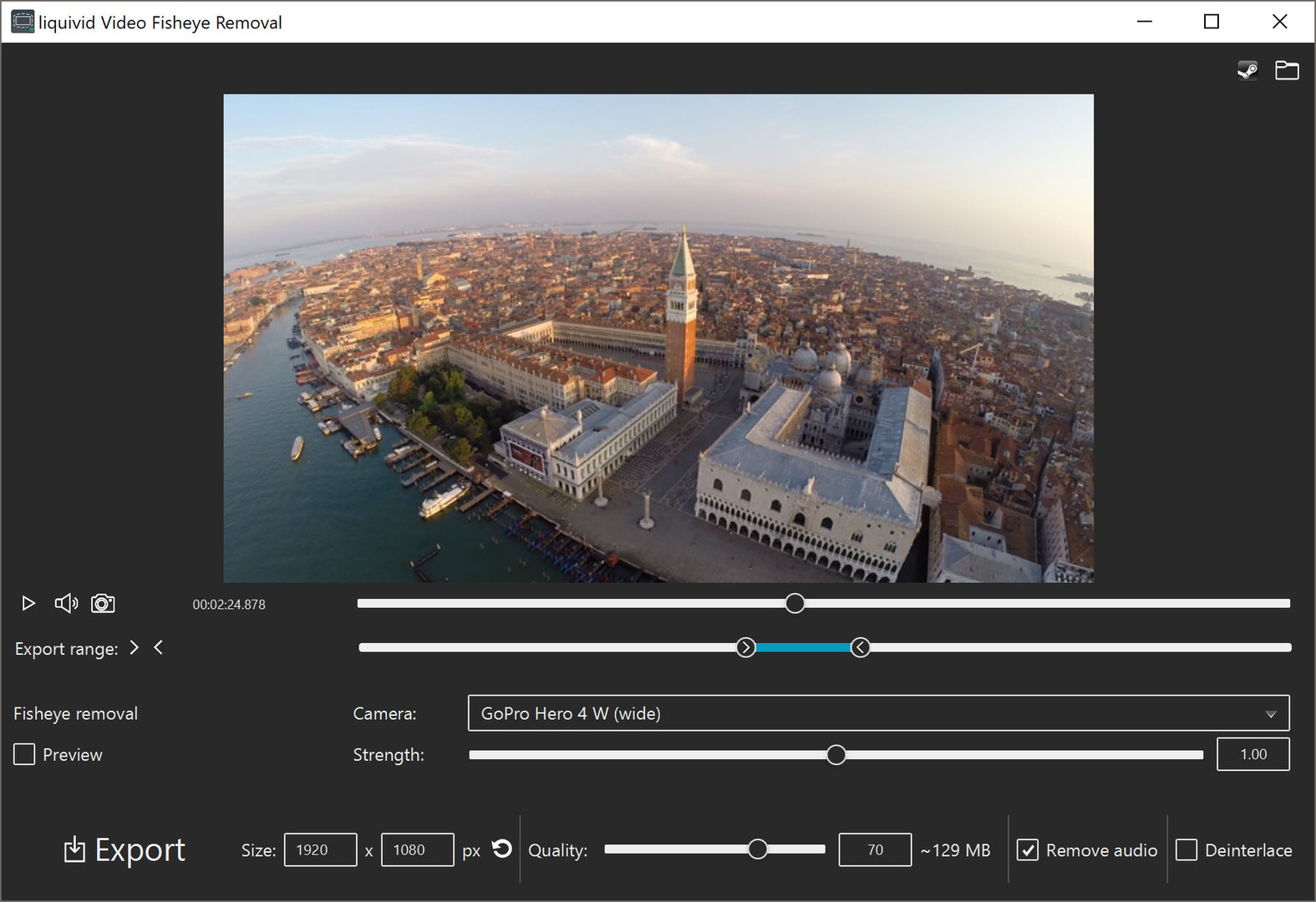 Liquivid Video Fisheye Removal is an easy-to-use app that removes fisheye distortion from videos taken with action cameras or other extreme wide angle lenses.