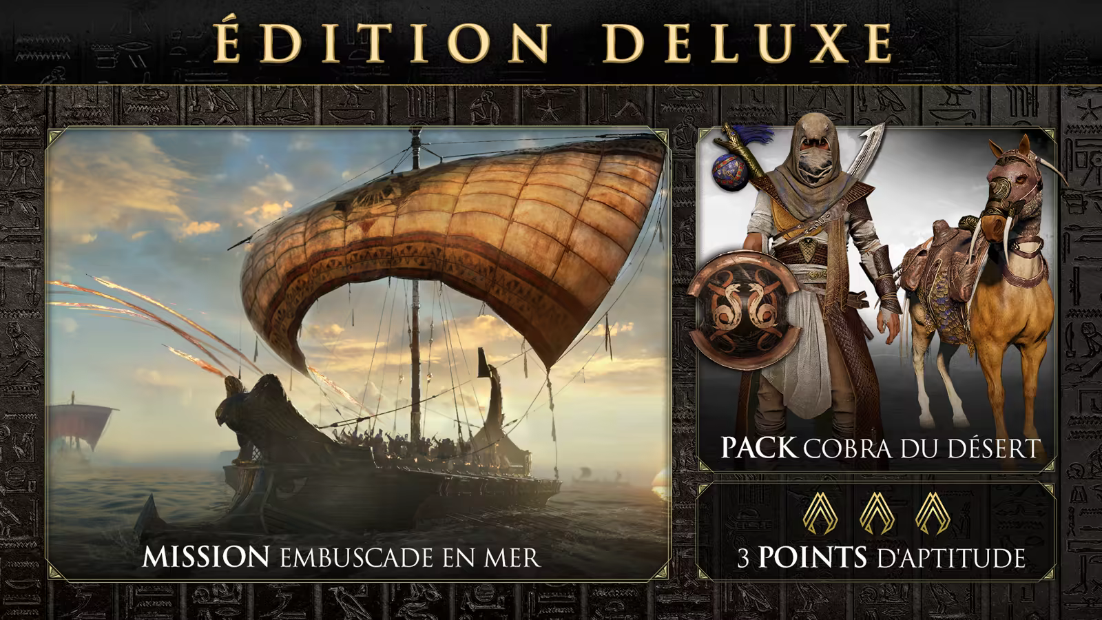 Des déserts aux oasis luxuriantes, de la mer Méditerranée aux tombeaux de Gizeh, naviguez sur le Nil et affrontez de dangereuses factions antiques et des bêtes sauvages en explorant cette terre aussi immense qu'imprévisible.