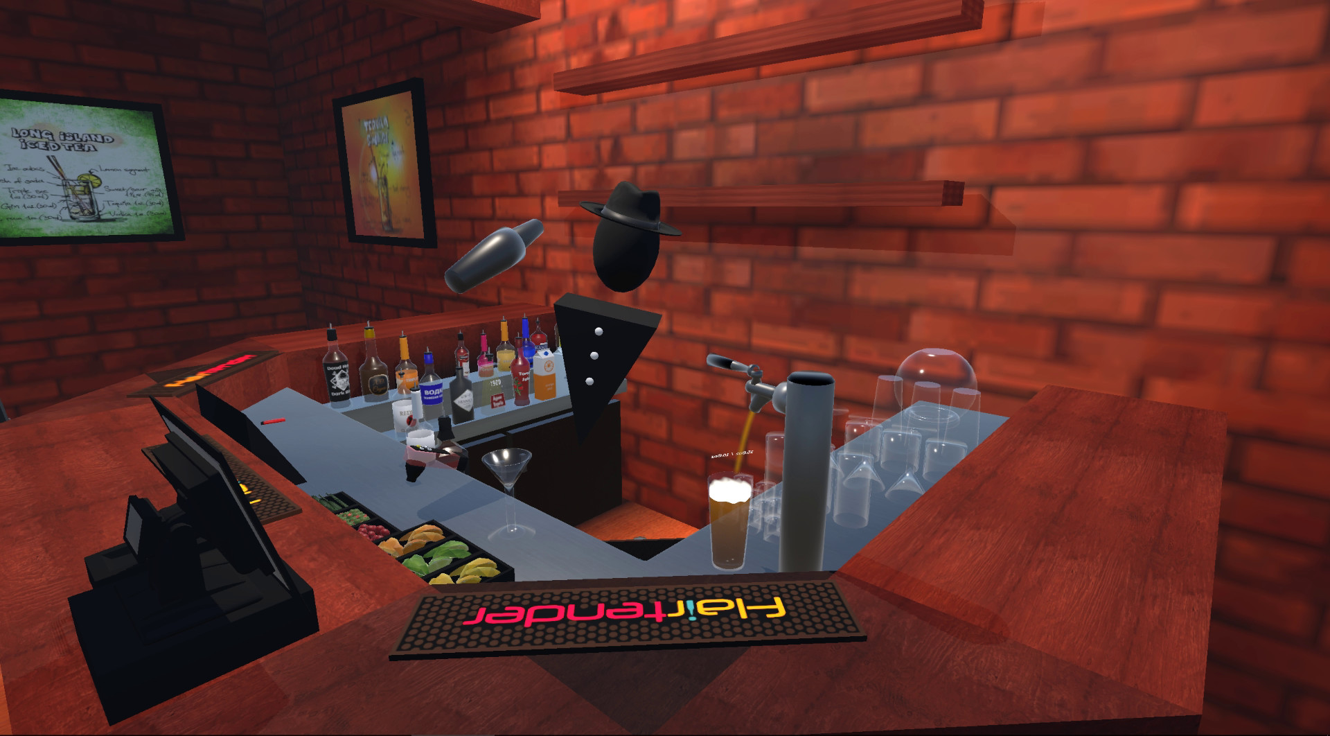 Flairtender is a virtual reality bartending game that has you mixing drinks with style! Start off small making a few simple cocktails, and in no time you'll be a master mixologist. Your drinks will be judged on speed, accuracy, and style, with better tips coming from better drinks! Use this cash to build up your bar and expand your repertoire. Create your own personal cocktails and add them to the game!