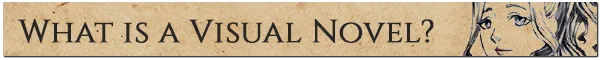 A Visual Novel is like an interactive novel, where the reader can make choices. It is text-heavy but features images, sounds and music that help you become immersed in the story.