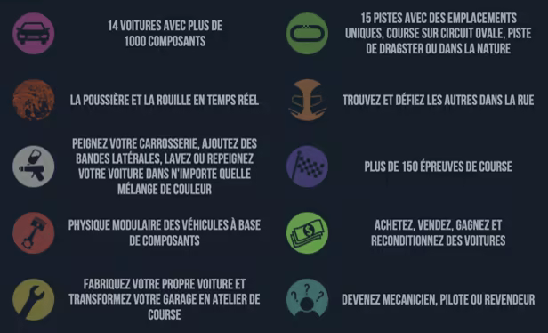 Vous devez vous considérer comme l'un de ces maniaques du graissage connus sous le nom de « Revheads » ! Vous pouvez acheter ou vendre des voitures et des composants, réparer et faire des réglages pour que votre voiture soit la plus rapide possible. Cependant, une bonne voiture de course n'est pas toujours celle qui est la plus rapide ou la plus puissante, mais celle qui est en harmonie avec son pilote. Ajustez votre voiture en fonction de vos compétences de conducteur et des conditions de course.