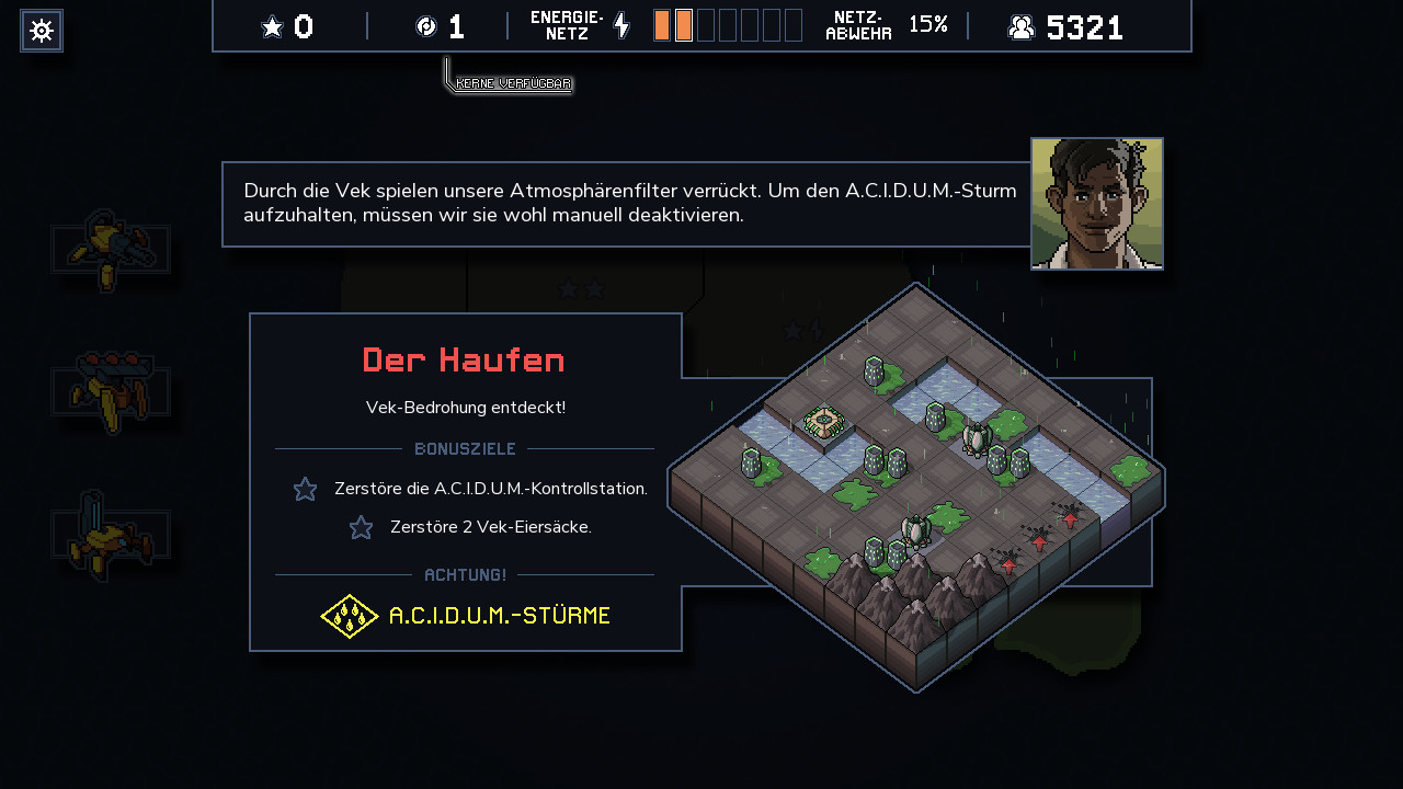 • Verteidige die Städte: Zivilgebäude versorgen deine Mechs mit Energie. Schütze sie vor den Vek und achte auf dein Feuer!