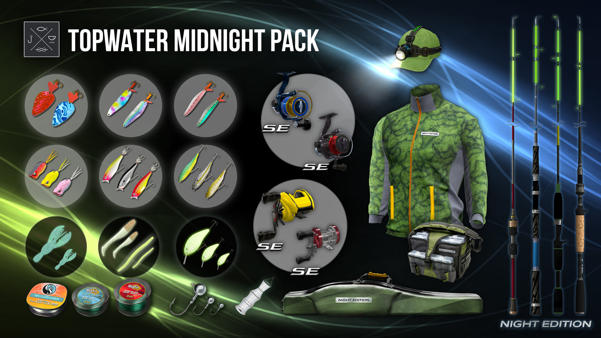 With the TOPWATER MIDNIGHT PACK you also get a whole bundle of goodies, including wide array of various lures and terminal tackle as well as cool new outfits, equipment, pond passes and licenses - all you need to enjoy your topwater or night hunting to the fullest!