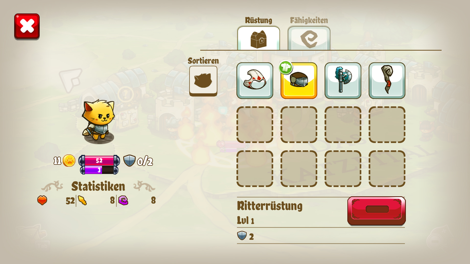 Statte deinen Katz-Abenteurer mit einem großen Körbchen an Ausrüstungsgegenständen aus! Setzt du am miezten Zaubersprüche ein? Dann zieh dir die geheimnisvolle Robe und Kapuze an und schnapp dir einen Stab, um Manareserven anzulegen! Willst du dich selbst vor Attacken schützen? Dann statte deinen Katz-Abenteurer mit einer Kettenrüstung aus, um deine Lebenspunkte zu steigern und zusätzlichen Schutz zu erhalten. Waffen, Rüstungen und Zaubersprüche können frei miteinander kombiniert werden, um die für deine Spielweise perfekten Kombinationen zu bilden!