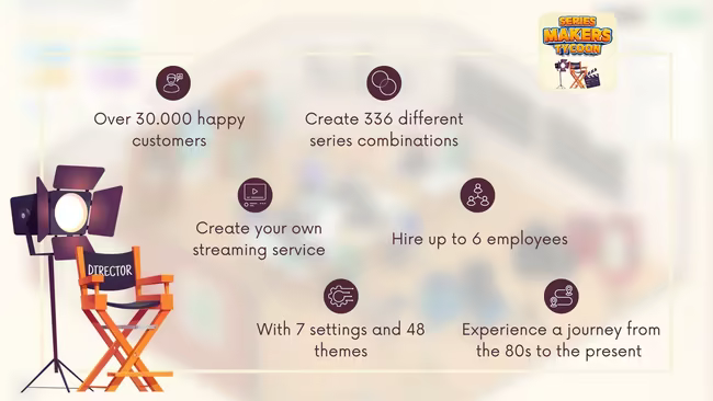 In Series Makers you live your own directors' dream. You start in the 80s at the Netklix-University developing your first own series. Soon you will reach big success and earn tons of money. Be prepared to build your own series and streaming empire, in the world of Series Makers.