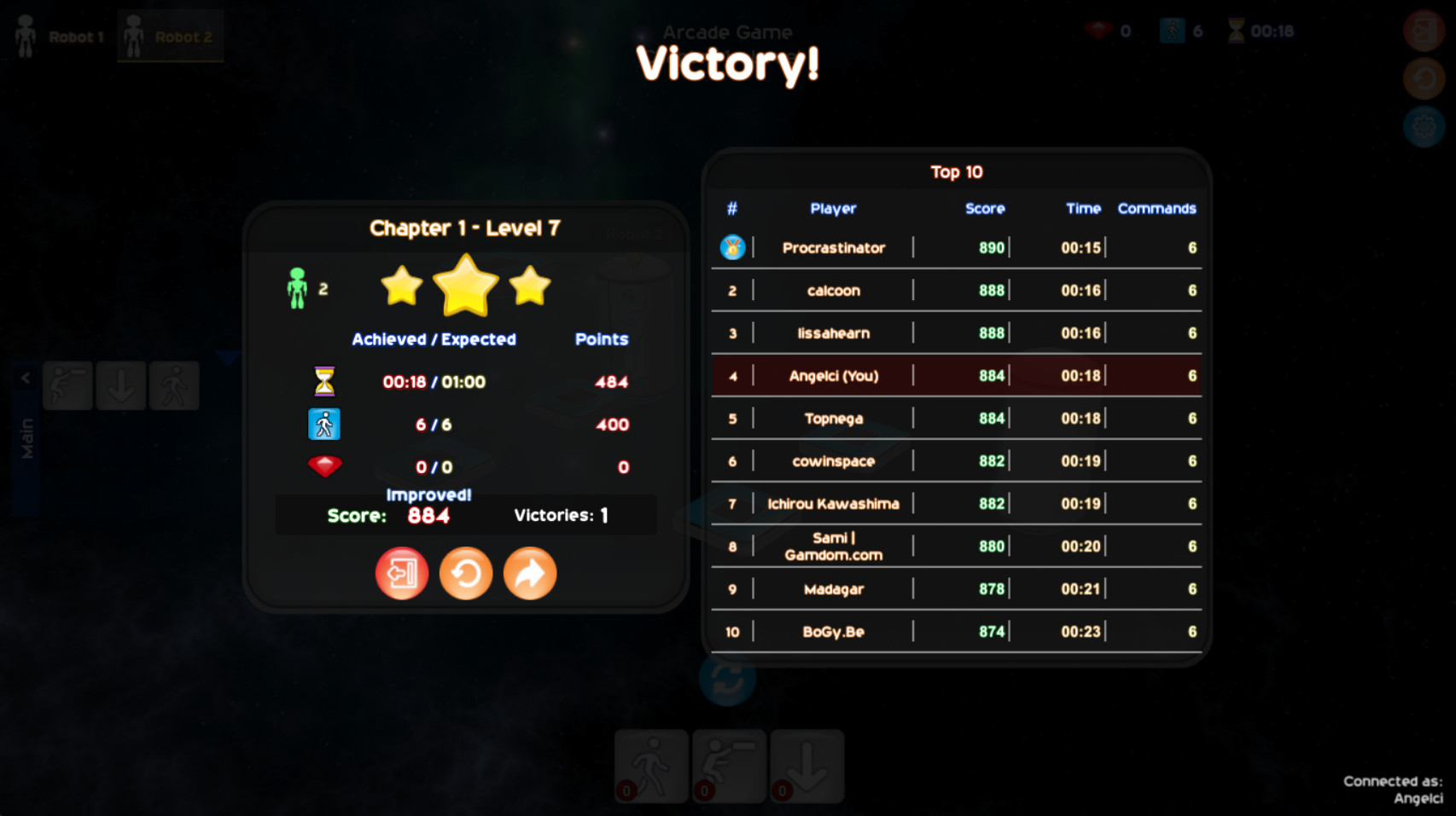 Get the best score by collecting all gems in game, getting a better time and using less commands to reach de victory!