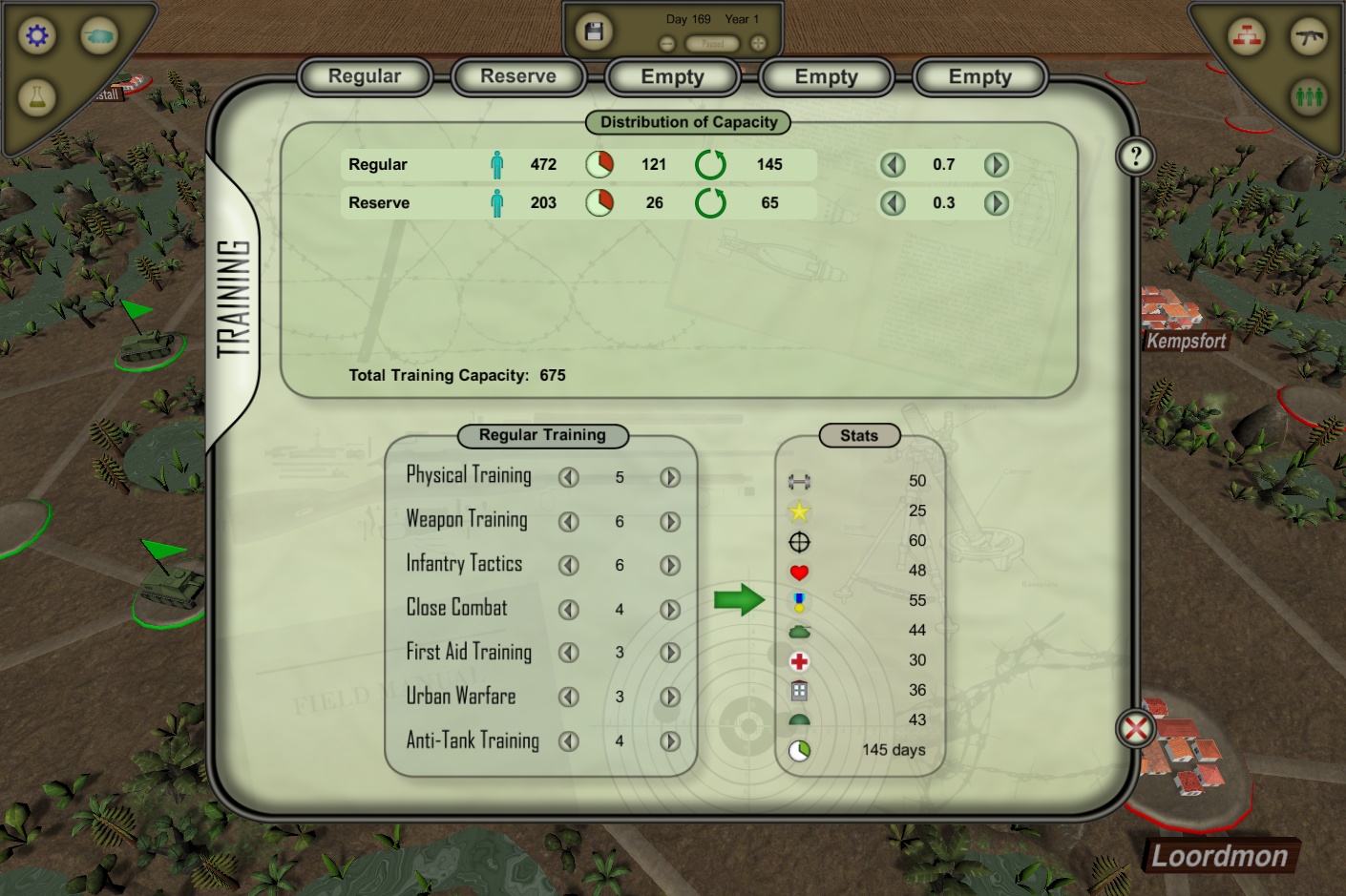 Proper training is essential for victory. Inadequate training will cause increased casualties, while good training will generate combat bonuses. The training capacity is also limited: optimize carefully.