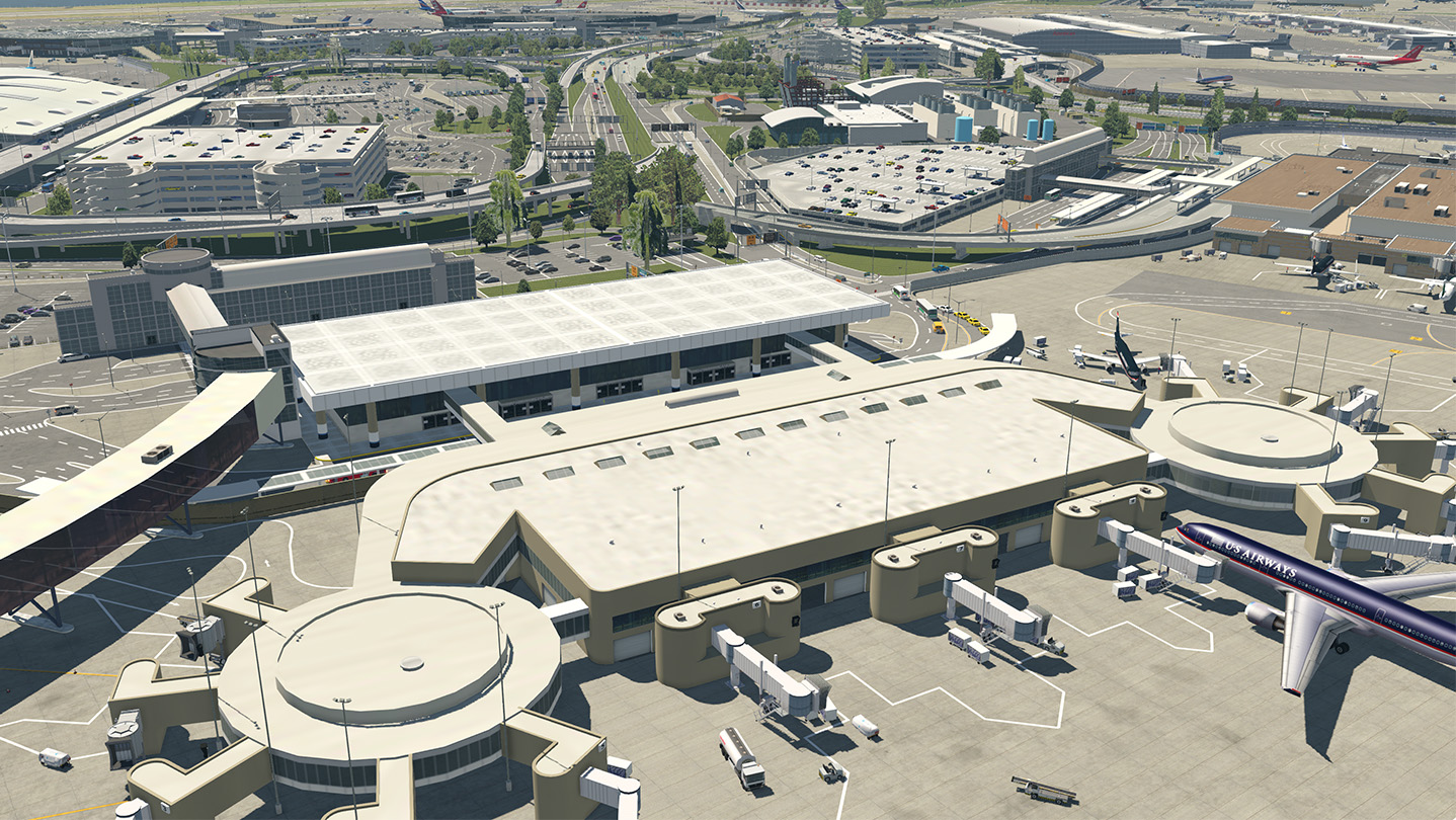 With over 20,000 objects and 1000 separate animations, it will take you a long time to see everything at this airport. There is all new lighting, airport vehicles running around, new overpasses, trees, airport and road signs, cars, taxiways, buses, vans and limousines on the "city-side" of the terminals.
