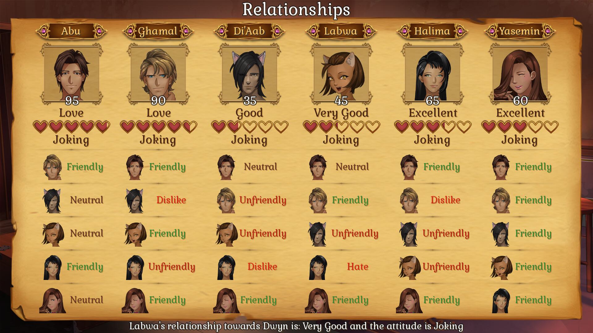Labwa, la rebelle – elle peut sembler frivole, rebelle et aguicheuse, mais tous ceux qui l’ont sous-estimée ont fini morts. Elle peut se faufiler ou se battre pour se sortir de n’importe quelle situation, et elle était imbattable dans l’arène avec Chalassa, son ancienne amante. Elle partage ses origines d’esclave avec Di'Aab, son ami de longue date.