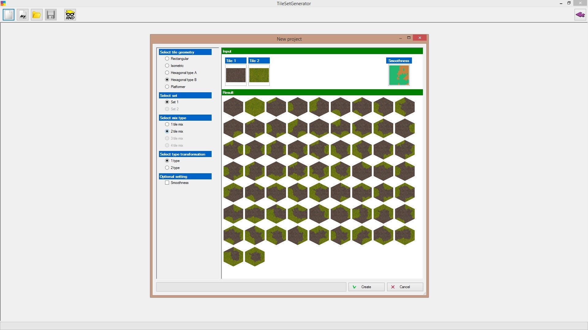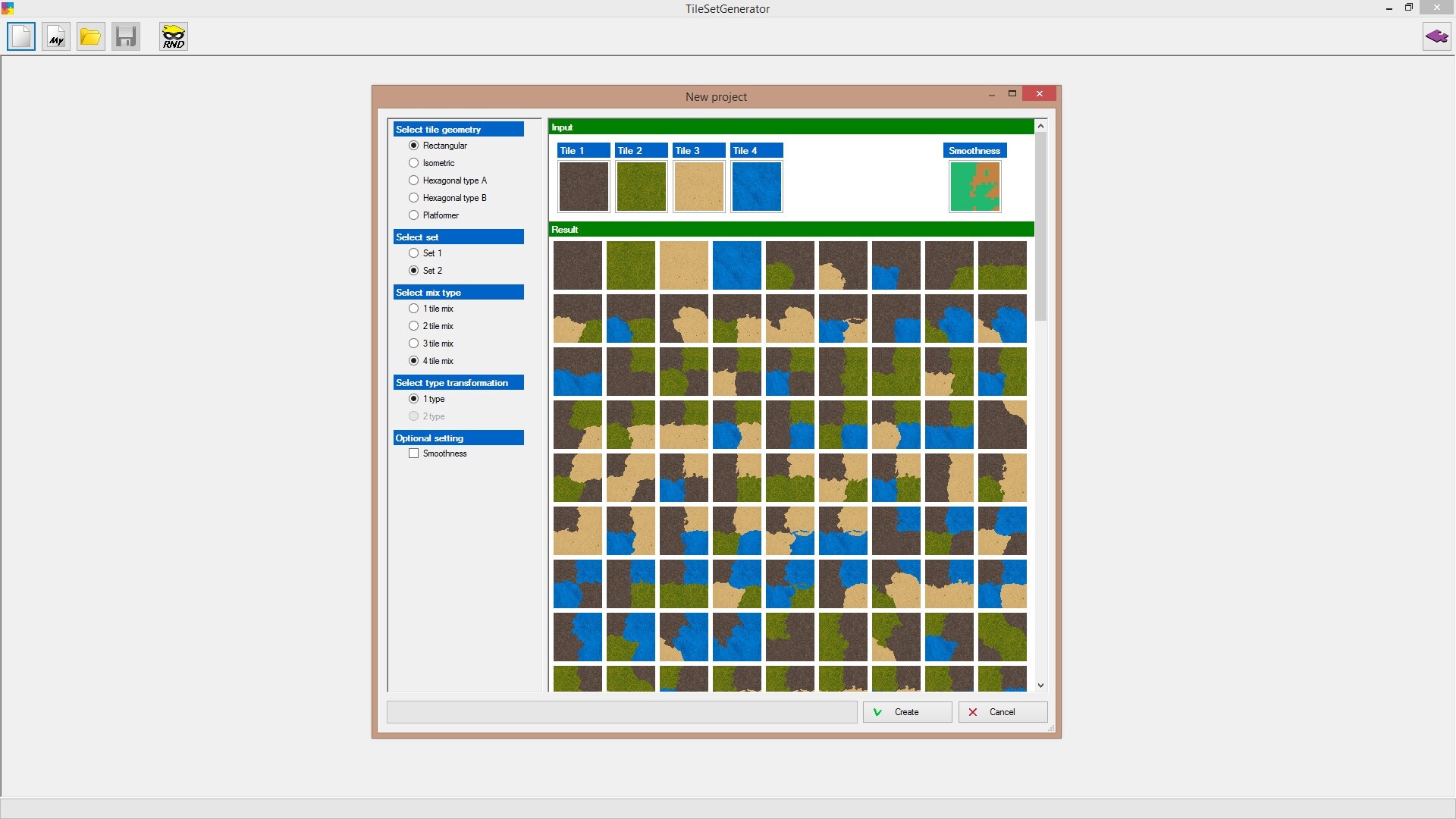 The program generates a tile transition map from textures (using built-in masks). You can select how many textures will be mixed (1-4). And of course you can select any textures you want.