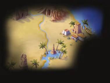 A beautiful map of Ancient Egypt shows all the various buildings. You can always view other sections of the map if scrolling is enabled at the top of the screen. By touching the gems at the map with your mouse you can get a preview of the building. You enter this building by left-clicking on it. Right-click on a gem shows the info screen explaining the meaning of the various gems. Only the finished buildings and the current building are shown at the map.