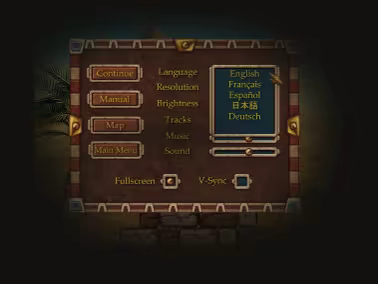 The following settings can be adjusted: Language - You can choose from English, German, Spanish, French and Japanese. There will be more languages later. Resolution - Drag the slider to select from 640x480, 800x600, 1024x768 and 1280x1024. Only works in windowed mode. Brightness - Can be adjusted if necessary. VSync - Vertical syncronisation avoids tearing but might slow down the game.