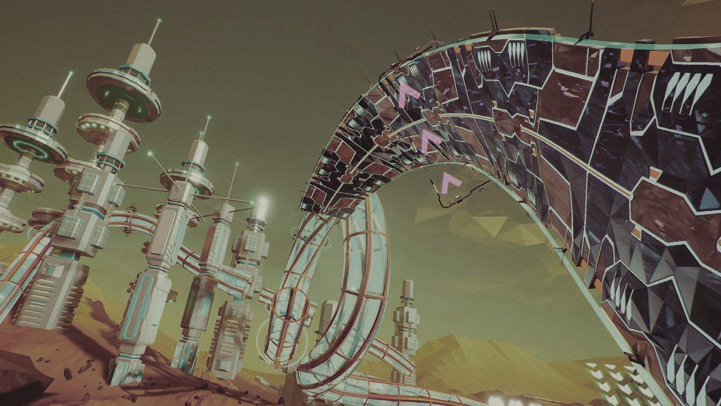The Solar Redout Racing League, the fastest racing league ever created, landed on Mars! The complex is situated in the Arabia Terra continent and the Red Planet shines with its dusty deserts and weird rock formations. The low gravity (approximately 38% of Earth's) played a major role in experimenting verticality and driving on the exterior of the common racing tubes, bringing back a true classic of the arcade racing genre.