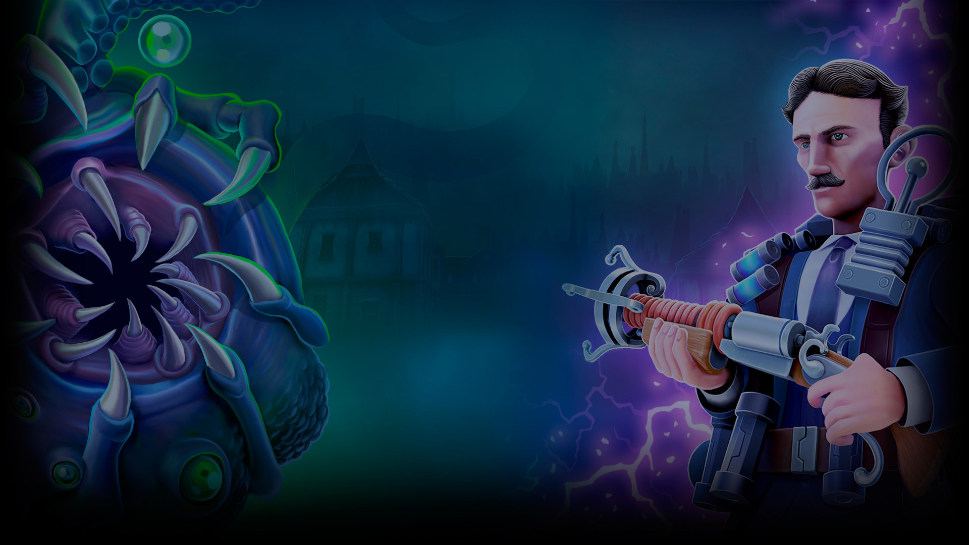Tesla vs Lovecraft is an intense top-down twin stick arena shooter from the creators of Crimsonland and Neon Chrome. Play as the enigmatic inventor Nikola Tesla harnessing the static energy to power up Tesla-Mech and give the lovecraftian nightmares a lesson in horror!