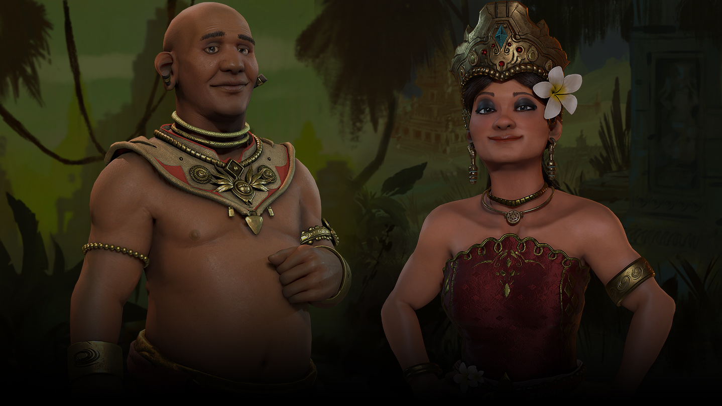 Jayavarman VII leads Khmer and Dyah Gitarja leads Indonesia in Sid Meier’s Civilization VI! Though each is versatile and unique, both civilizations bring new challengers to the religious game. Indonesia is a strong coastal civilization with potential for a huge Jong-powered navy, and the Khmer thrive in their populous riverside cities. Both of these civilizations come into play in the new “Path to Nirvana” scenario, where you compete to have the most followers of your religion on a unique Southeast Asia map.