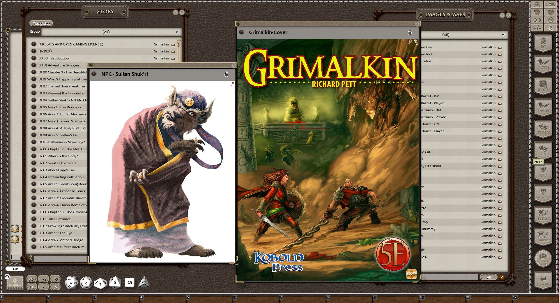 Grimalkin is an adventure for 3rd to 5th level characters and compatible with the 5th Edition of the worlds first roleplaying game. Set in the city of Per-Bastet in the Southlands Campaign Setting, it is meant for play either as the thrilling sequel to Cat and Mouse, or as a standalone treasure hunt!