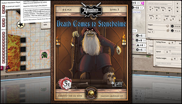 Requires: The free Fantasy Grounds virtual tabletop (VTT) software and the included 5E Ruleset.