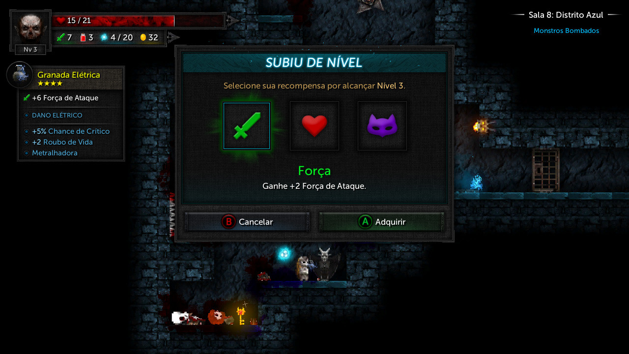 • LUTE. Cada sala contém mais inimigos conforme você avança.