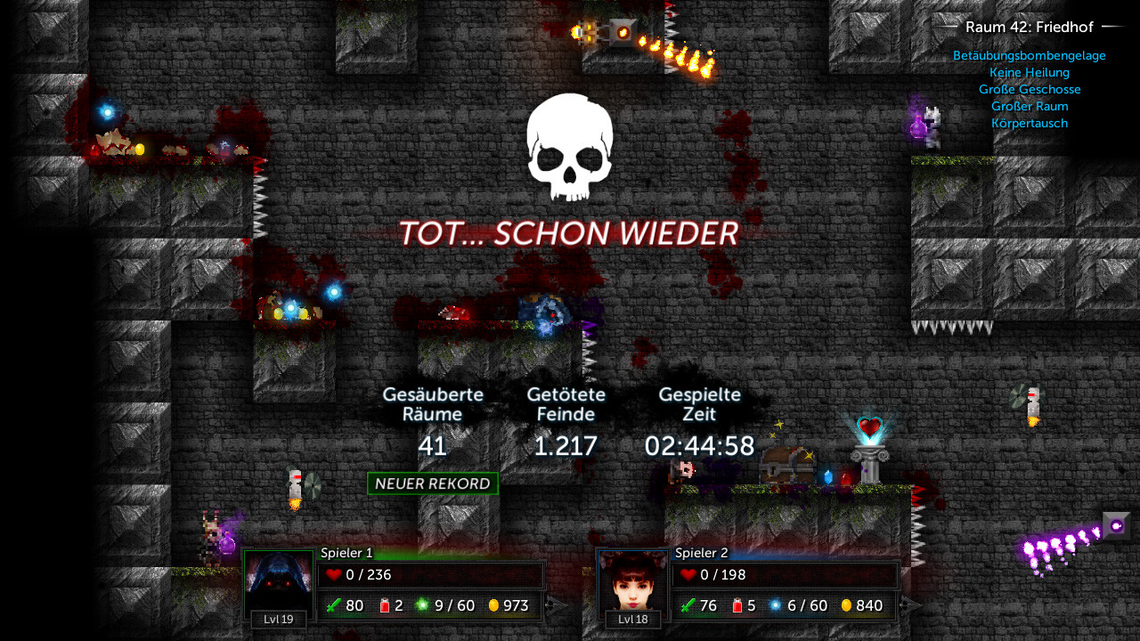 • ROGUELIKE-TYPISCHE ZUFÄLLIGKEIT. Räume, Feinde, Gegenstände und Modifikatoren werden bei jedem Durchlauf prozedural generiert.