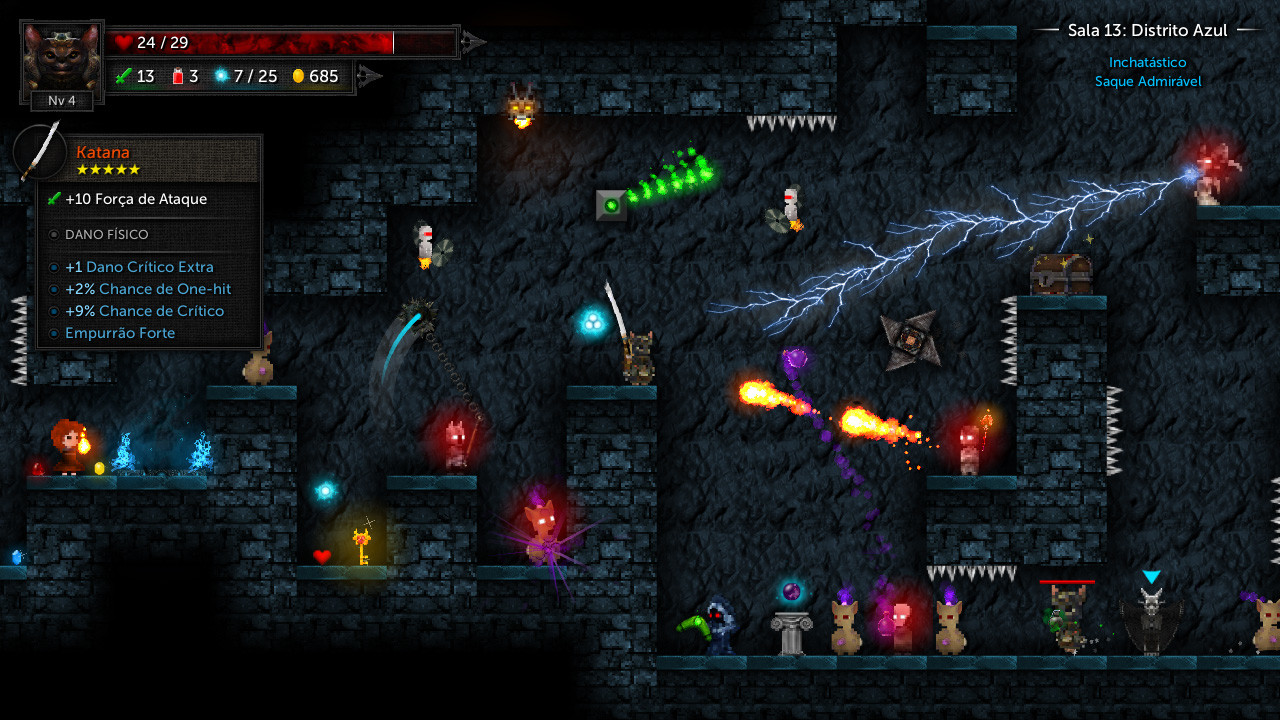 • ALEATORIEDADE ROGUELIKE. Salas, inimigos, itens e modificadores são metodicamente gerados a cada partida.