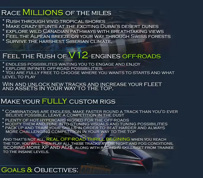 The driving impression is authentic and realistic, at the same time arcade and simulation-like, physics is very complex, featuring tons of high-end algorithms that controlling interactive aspects of vehicles and they are carefully improved over years of research and extended design of "Arizona Derby" to make it utterly fun, and some aspects of the physics may see as arcade and it's intended to be since the game is not a fully accurate off-road simulation, but having most of those aspects since it's an arcade racer. Gameplayhighly recreating the spirit of the real off-road racing experience with that glimpse of arcade racing, to make it more fan and enable players to do more exciting stunts. Ai opponents are ultimately smart, skilled for the off-roads drive, so you need to reach a unique set of skills needed for realistic off-road terrains. You need to take care of how fast and at which angle going over jumps and bumpy roads, sometimes shortcuts ain't the best path to lead the race and you can rollover. Every track, from the current 31 tracks is specific and needs training, a strategy that works on one level is different on another, the same is with an approach to win. Training is most important and over time you can increase the difficulty and achieve more XP/AD$ rewards. You can play dirty and hit out racers aside, and score more as of that, but you will risk they hit you harder and even more intrusive.