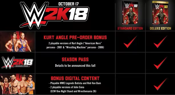The biggest video game franchise in WWE history is back with WWE 2K18! The Deluxe Edition grants access to the WWE 2K18 Season Pass, MyPlayer Kick Start, Accelerator, two playable versions of Kurt Angle, Cena (Nuff) content and more!