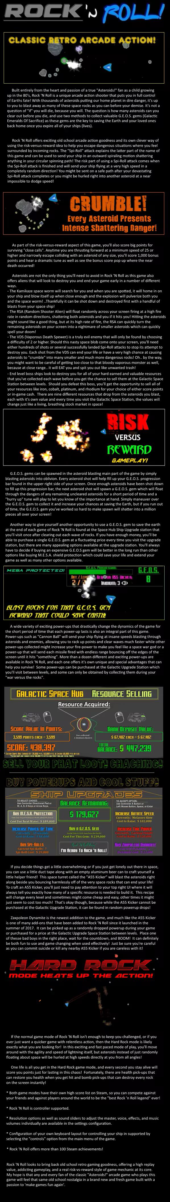Rock 'N Roll is an action/arcade deep space adventure where your purpose is to save the Earth via collecting powerful G.E.O.S. gems (Galactic Emeralds of Sacrifice) It offers tons of upgrades, power-ups, and replay-ability in an easy to understand but difficult to master retro adventure!