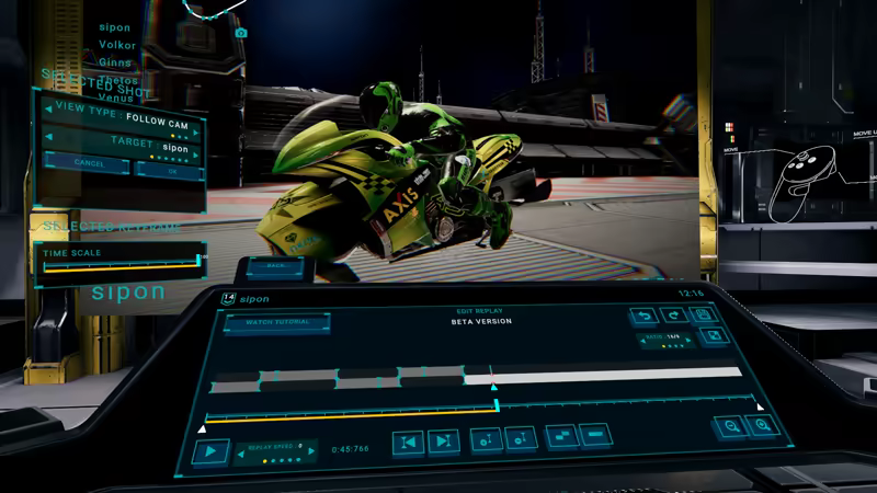 Pause time mid-race, fly through your replay, and capture your best moments from any angle