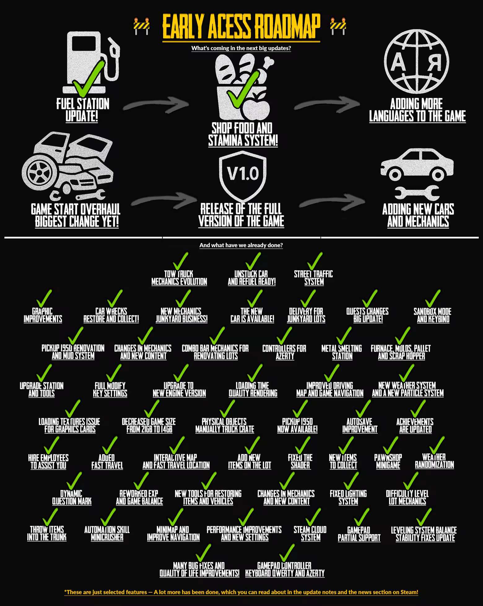 «The current version of Early Access is fully playable and the core gameplay loop is already in place. For this moment the game contains multiple Junkyard related mechanics like: vehicle and stationary press operation, item and vehicle renovation, scrap selling, scavenging and many more that you can find on your own. It is already possible to finish the game, but the game mechanics will undergo balance changes, and we plan on reworking and polishing many aspects of the game.»