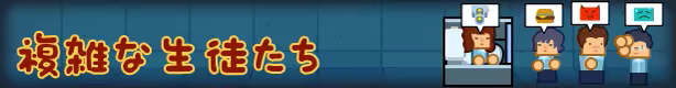 衛生、空腹、しつけといった様々な要素によって、生徒たちの意欲は変動します。ゲームが進むにつれて、管理が必要な項目は増えていくでしょう。