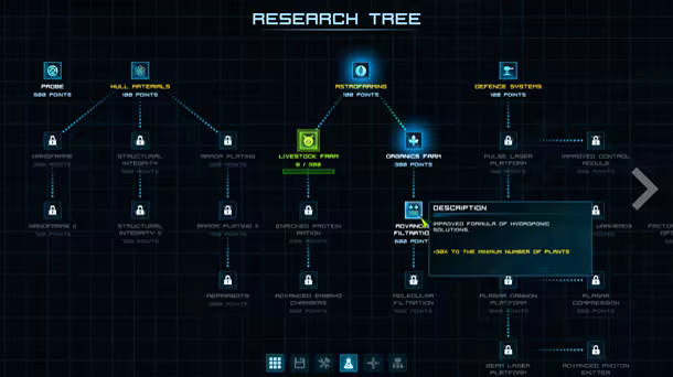 Use the Scientific Research Map to unlock special bonuses and technologies that affect some vital aspects of your station ecosystem such as the speed of resource depletion, the power of your defense weapons, the growth rate of livestock and so on. Trade ores and other resources with space merchants to avoid running out of funds or supplies.