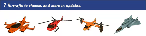 There are 7 helicopters from slow to ultra fast and with different capabilities. You can also make your own textures for the helicopters.