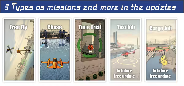 You can choose several types of missions as Dogfights and Chases, and Time Trials races. Or just go into Free Fly to explore and race through the city, and find accessories and bonuses. On a update will be supported Taxi Jobs and Cargo Jobs.