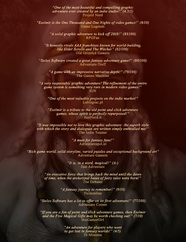 Thanks for your interest in our game! We would like to make you aware in advance that "Eselmir and the five magical gifts" is a slow-paced game with a lot of reading. For this reason, we encourage you to read reviews from the press or from other players and watch some video walkthroughs before to buy the game.