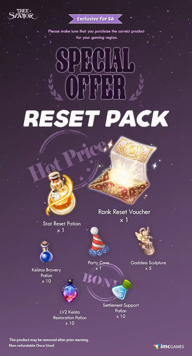 Notice: At the request of the publisher, Tree of Savior - Reset Pack for SA Servers is unlisted on the Steam store and will not appear in search.