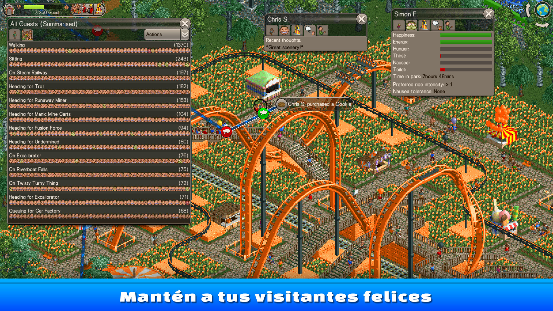 - Escenarios de parque: Progresa a través de 95 escenarios de parques clásicos de RollerCoaster Tycoon® y RollerCoaster Tycoon® 2.