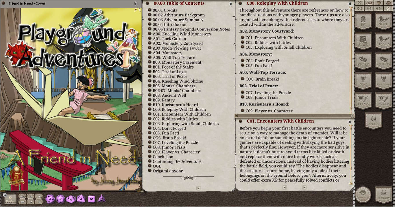A Friend in Need is a stand-alone mini-adventure for 5th Edition and 1st level characters. Recommended for ages six and up, this module includes adventure content as well as advice for gaming with children.