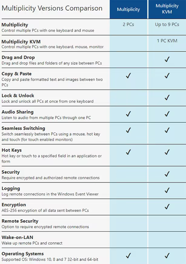 Combine the power of multiple machines and shed the hassle (and cost) of traditional KVM boxes. With Multiplicity KVM, you can control up to 9 PCs with a single keyboard and mouse completely wirelessly, freeing up your workspace by removing the cables and extra hardware needed for a traditional KVM switch. This versatile, secure, and affordable software solution makes working across multiple computers a breeze.