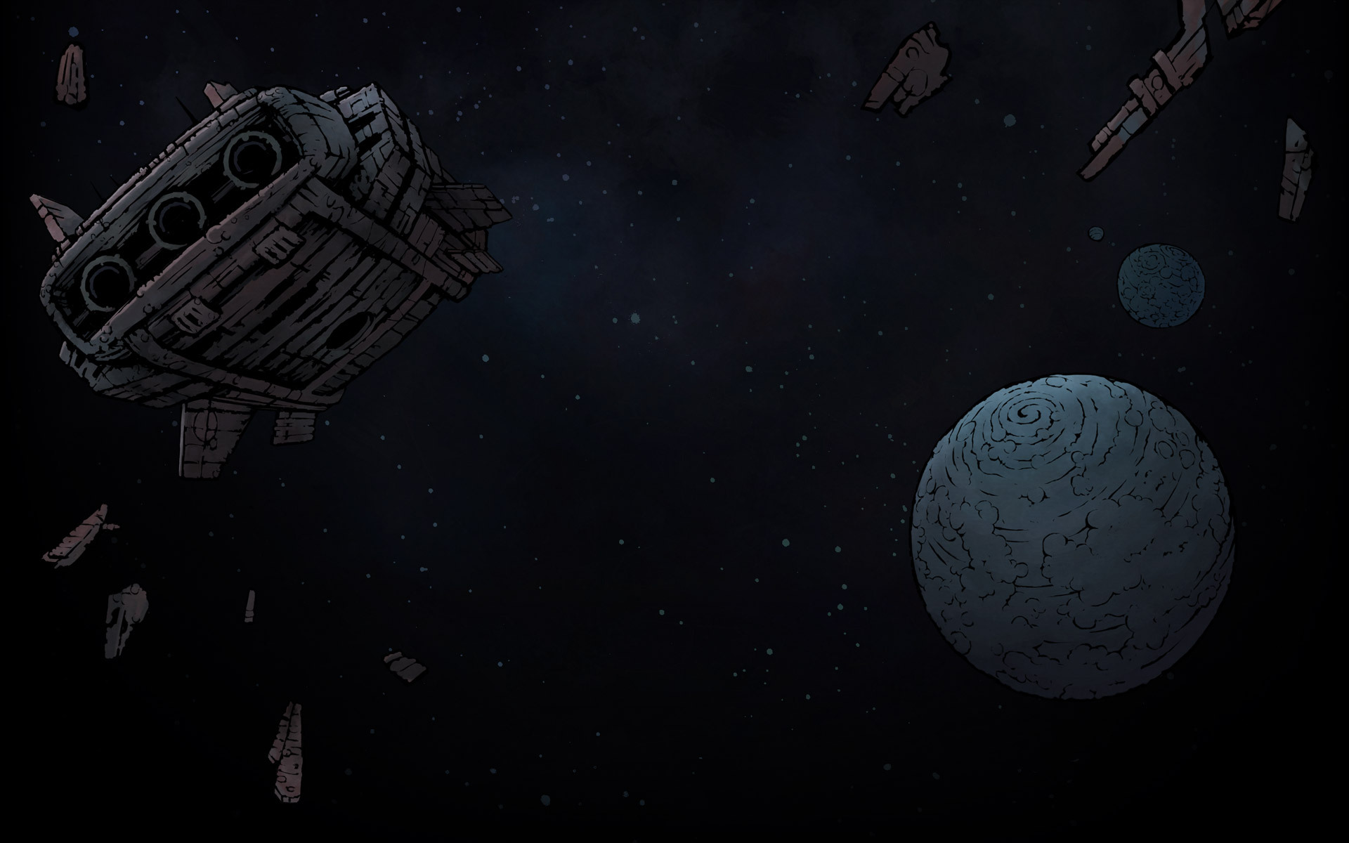 Build and control a squad of up to three mercenary characters and set on to explore derelict ships within your reach from the scavenger's base. Searching the derelicts for loot and clues, you come across many friendly inhabitants and traders, but more often – various enemies. Challenge and defeat them in tactical turn-based fights, where randomly-drawn cards form your changing arsenal of combat actions, gain experience for yourself and your crew, loot dead bodies, resupply and upgrade once back at your base. The scavenger's home ship gives you the opportunity to heal and level-up your mercenaries, recruit new ones, equip them, upgrade their gear or recharge energy for life support during missions.