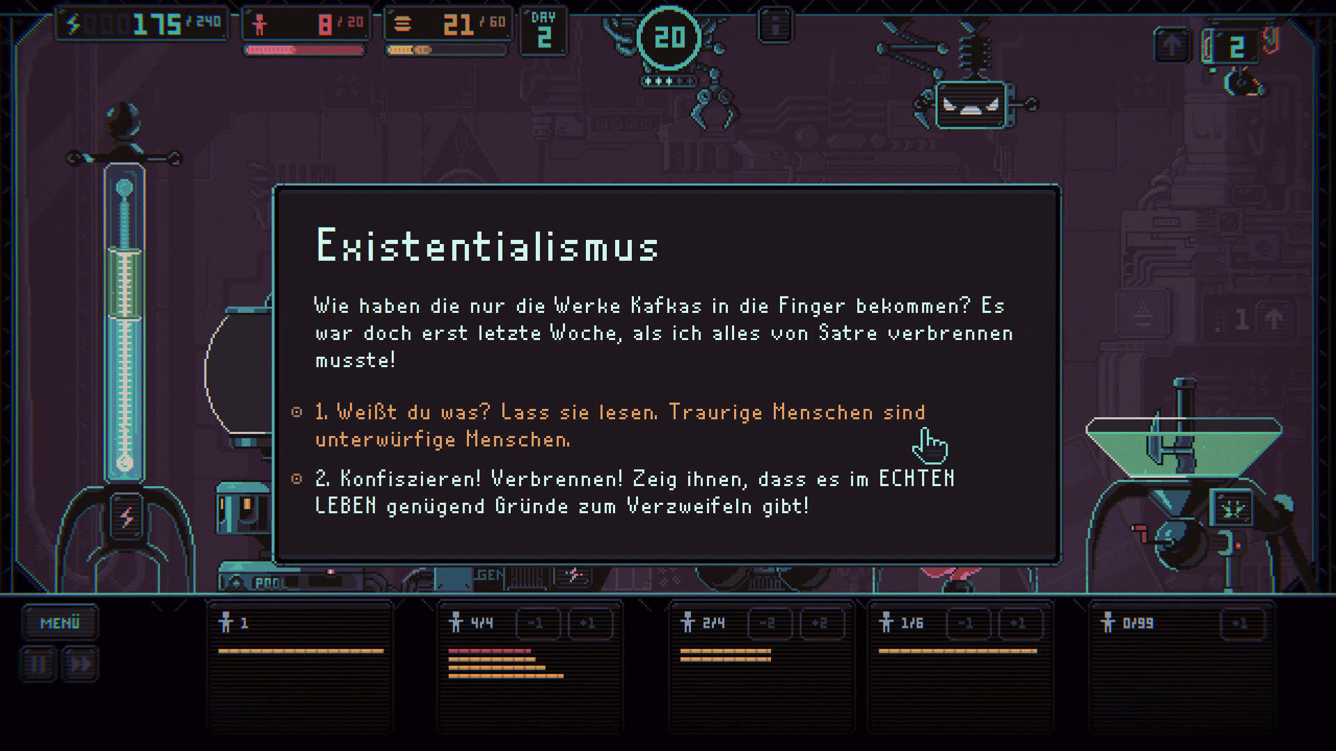 Die Menschheit wurde von einer KI unterworfen... was toll ist, weil wir auf der richtigen Seite des Konflikts stehen. Beute Menschen aus, um Strom zu erzeugen und deine Imperium auszuweiten. Du musst alles im Blick behalten, damit sie nicht an Erschöpfung oder Hunger zugrunde gehen... auch wenn die Schwächsten natürlich immer in den Bioreaktor geworfen werden können.