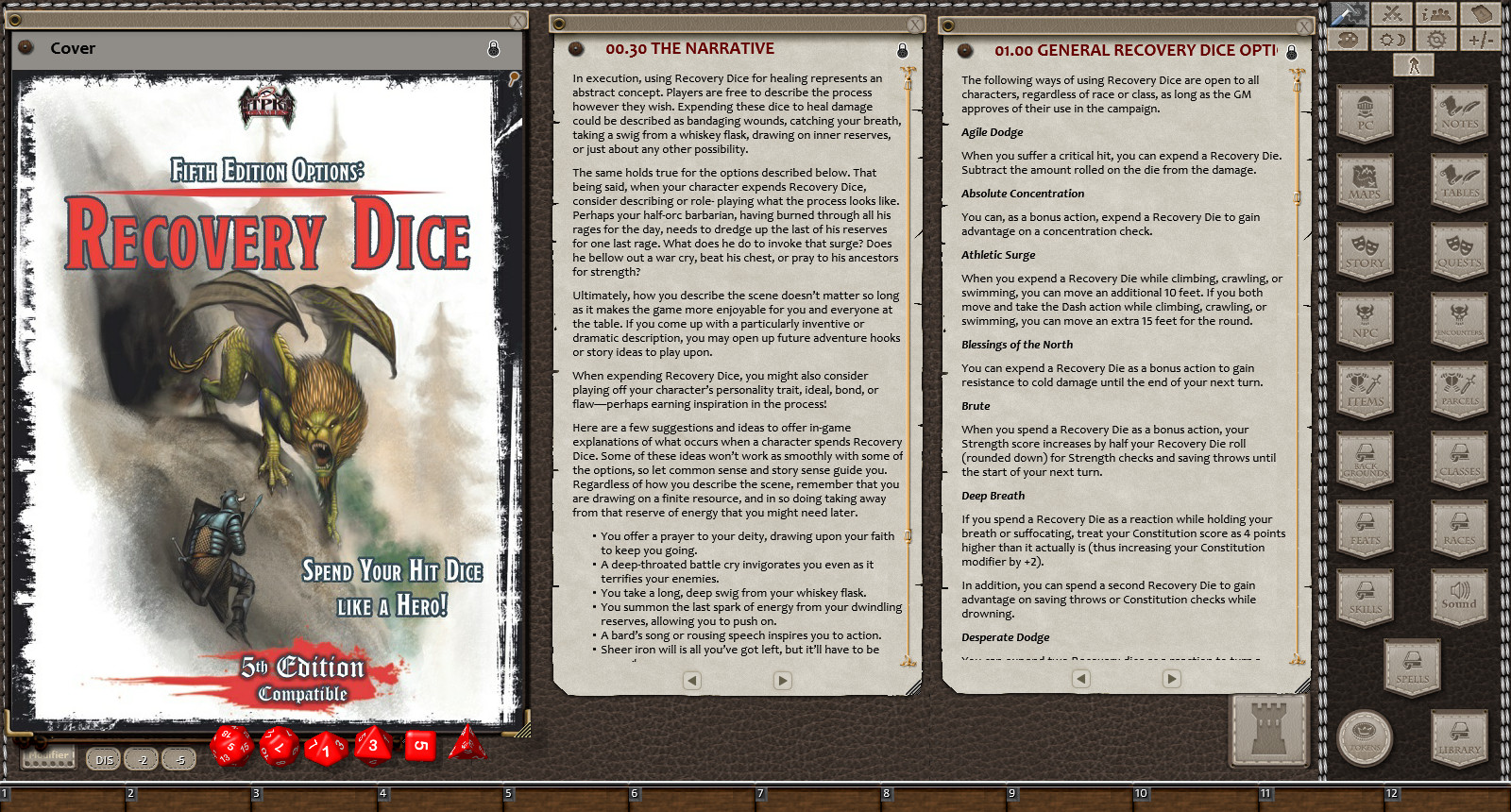 Within 5E, Recovery Diceotherwise known as Hit Dice allow a character to recover hit points without the need for healing potions or cure wounds spells. This serves to extend the adventuring day by delaying the partys need to return to civilization, which in turn allows characters to continue exploring dungeons, looting crypts, and slaying monsters. As described in the core rules, Recovery Dice represent a fire-and-forget healing system requiring minimal bookkeeping. As a result, most players tend to forget about Recovery Dice in the middle of a fight. But no more...